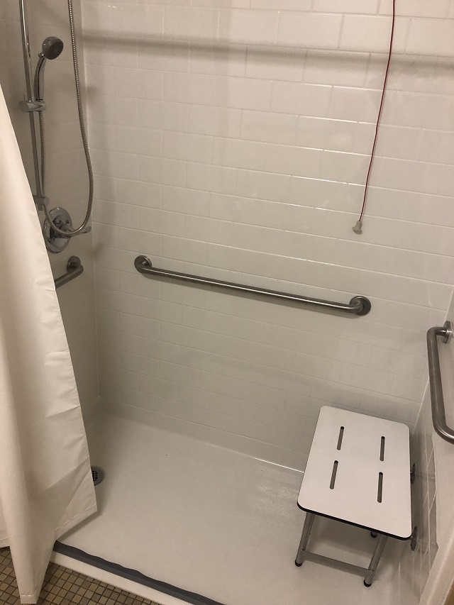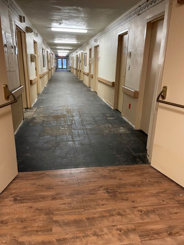 We have new floors and paint in the dining/entertainment area, with more modern paint going up in the hallways and rooms. The new walk-in showers are installed and looking great! Next, we're working on getting new artwork on the walls and a nice seating area in the back for families and residents to gather and relax.